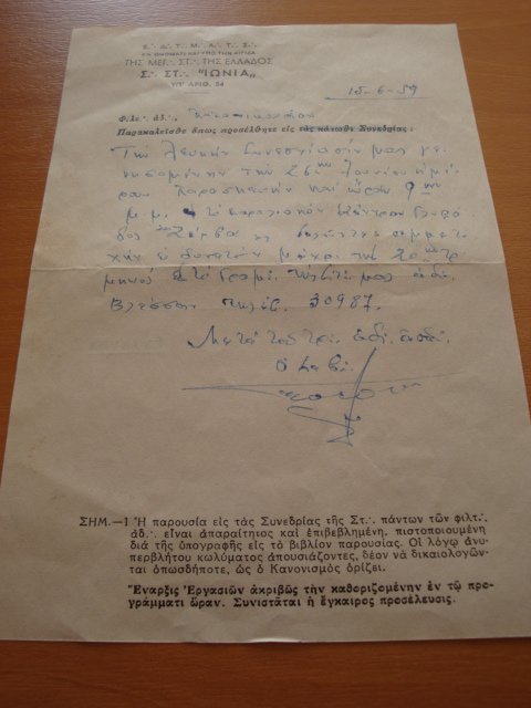 ΠΡΟΣΚΛΗΣΗ ΣΕ ΣΥΝΕΔΡΙΑΣΗ ΤΗΣ ΜΕΓΑΛΗΣ ΣΤΟΑΣ ΤΗΣ ΕΛΛΑΔΟΣ 15-6-1959 (ΧΕΙΡΟΓΡΑΦΗ)