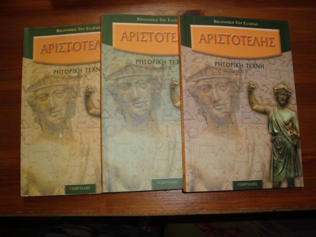 3 ΤΟΜΟΙ ,ΣΕΛ.(191+207+143)ΣΧΗΜΑ: 14Χ20,5 Π Ε Ρ Ι Γ Ρ Α Φ Η :Ο Αριστοτέλης υπήρξε ο επιστημονικός θεμελιωτής της Ρητορικής Τέχνης. Οι προγενέστεροι συνεκέντρωσαν όλην την προσοχή των στην επεξεργασία της τεχνικής δια την συγκίνησιν των ακροατών, ενώ ο Αριστοτέλης επεξεργάσθη την τεχνική της πειθούς με αποδείξεις, πράγμα που τον οδήγησε σε μια φιλοσοφική και ψυχολογική διερεύνηση του αντικειμένου του, όπως εμφανίζεται στα τρία βιβλία αυτού του βαθυστόχαστου έργου που φέρει τον τίτλο « Ρητορική Τέχνη». Η «Ρητορική» εγράφη κατά το 330 π Χ δηλ. κατά τον χρόνο της δευτέρας διαμονής του Αριστοτέλους στην Αθήνα.